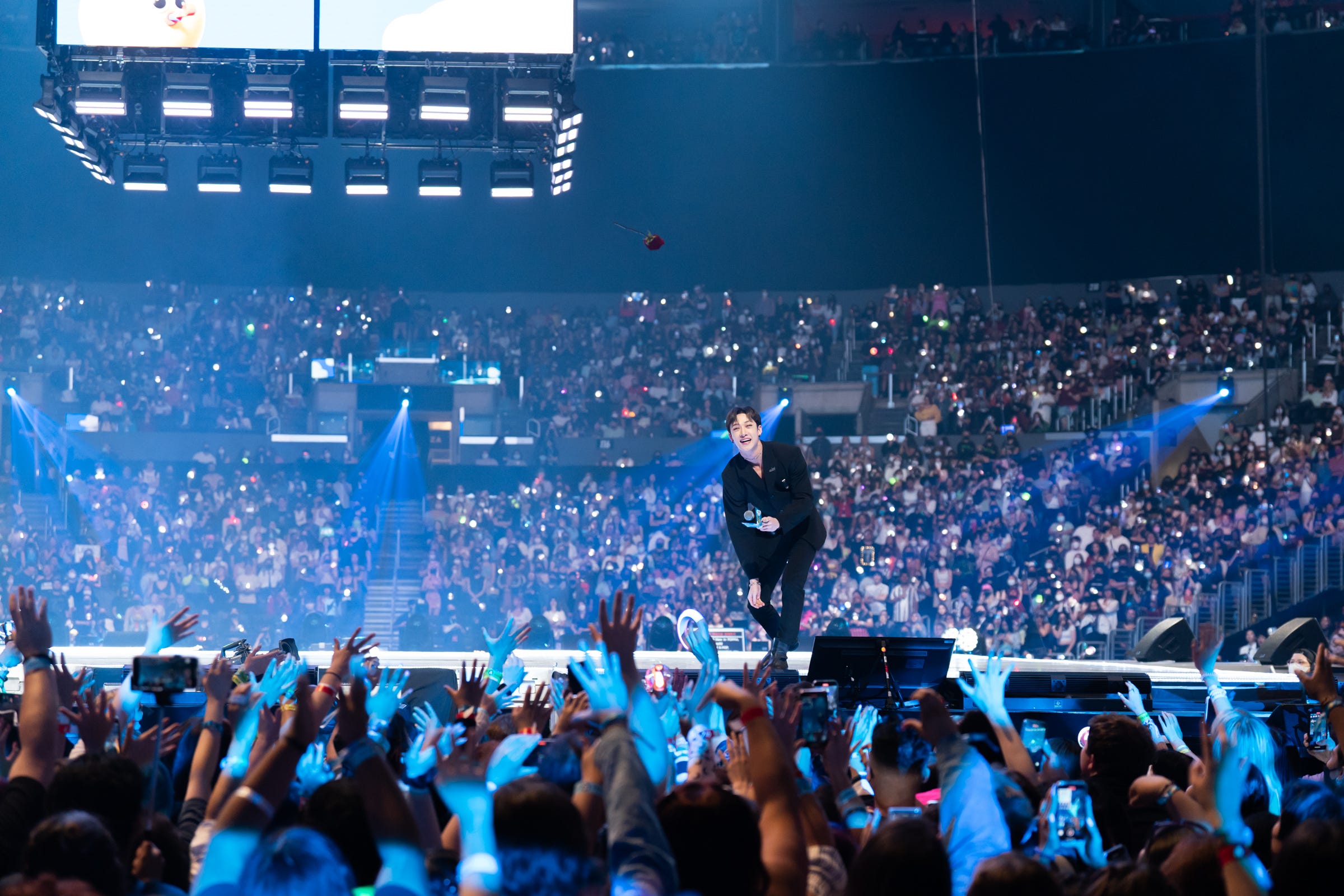 Stray Kids’ showmanship proved to be versatile, as several members were MCs earlier in the night. Felix and Hyunjin stood onstage to announce part of the night’s agenda, and although they certainly turned on the charm, Bang Chan cranked it up even more during his solo MC bit, tossing roses into the crowd and grinning from ear to ear as he expressed his genuine pride in being a presenter.